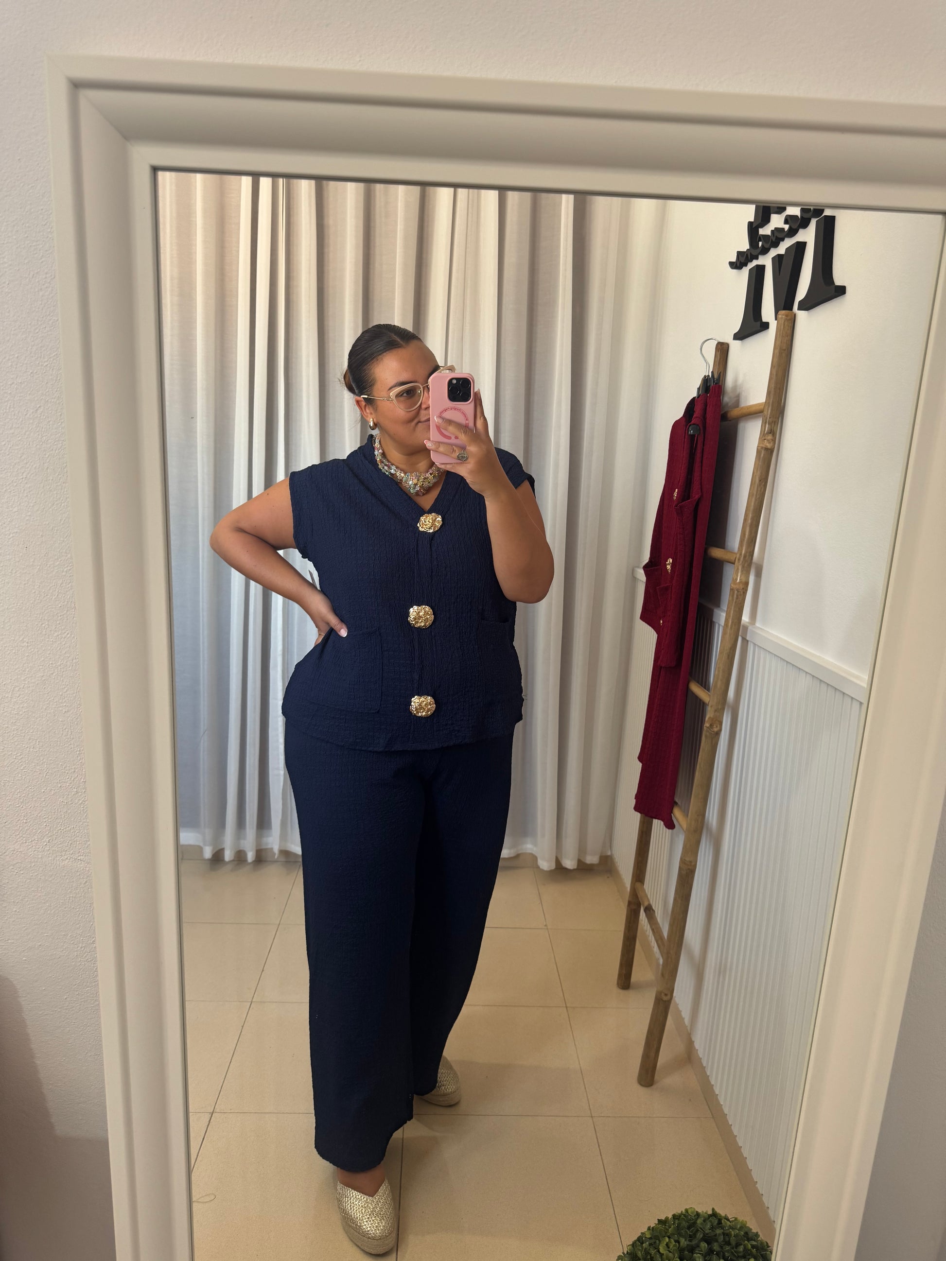 Conjunto de pantalón y blusa sin manga con decoración de botones (los botones son broches, se pueden quitar para lavar)
