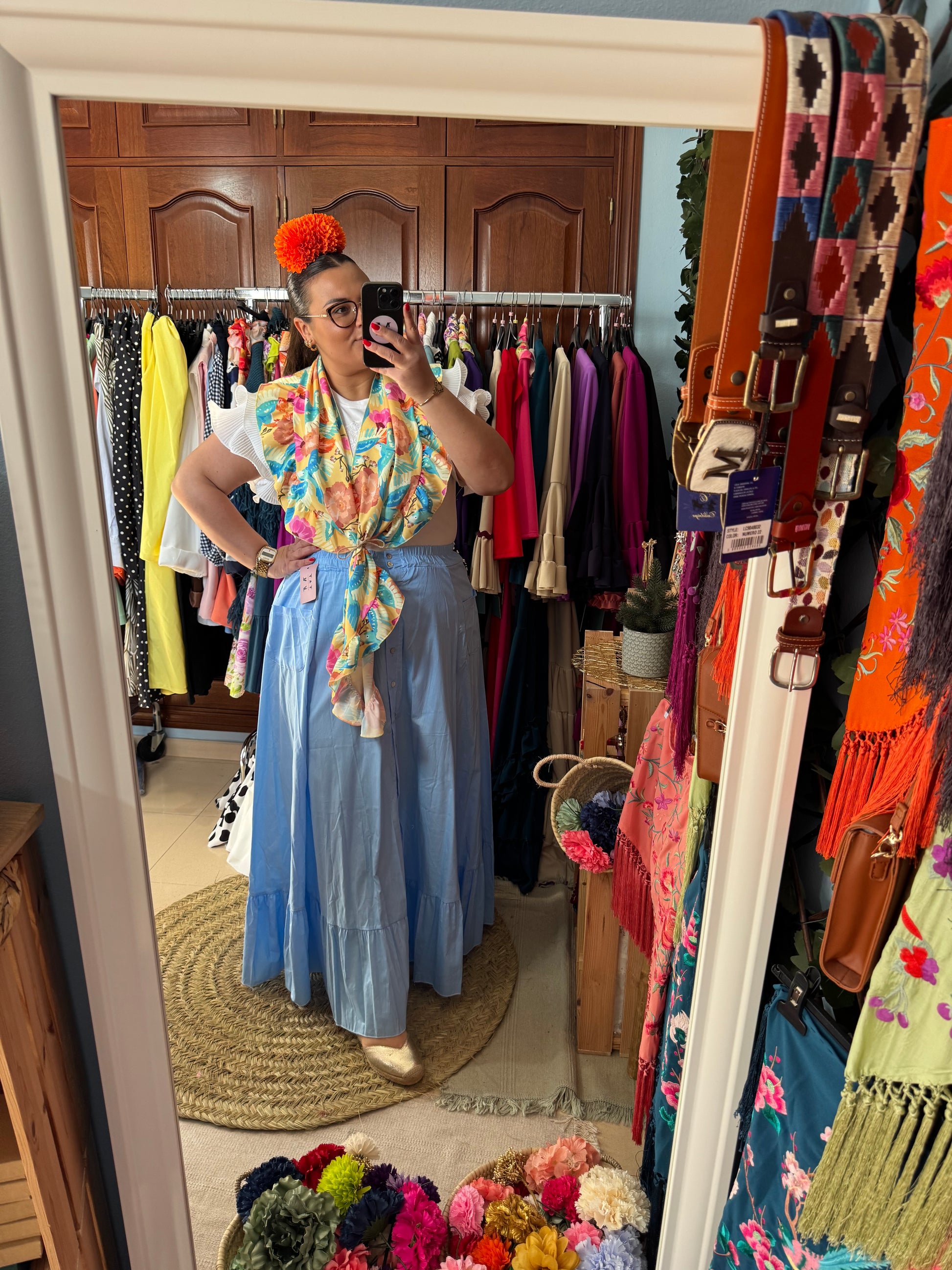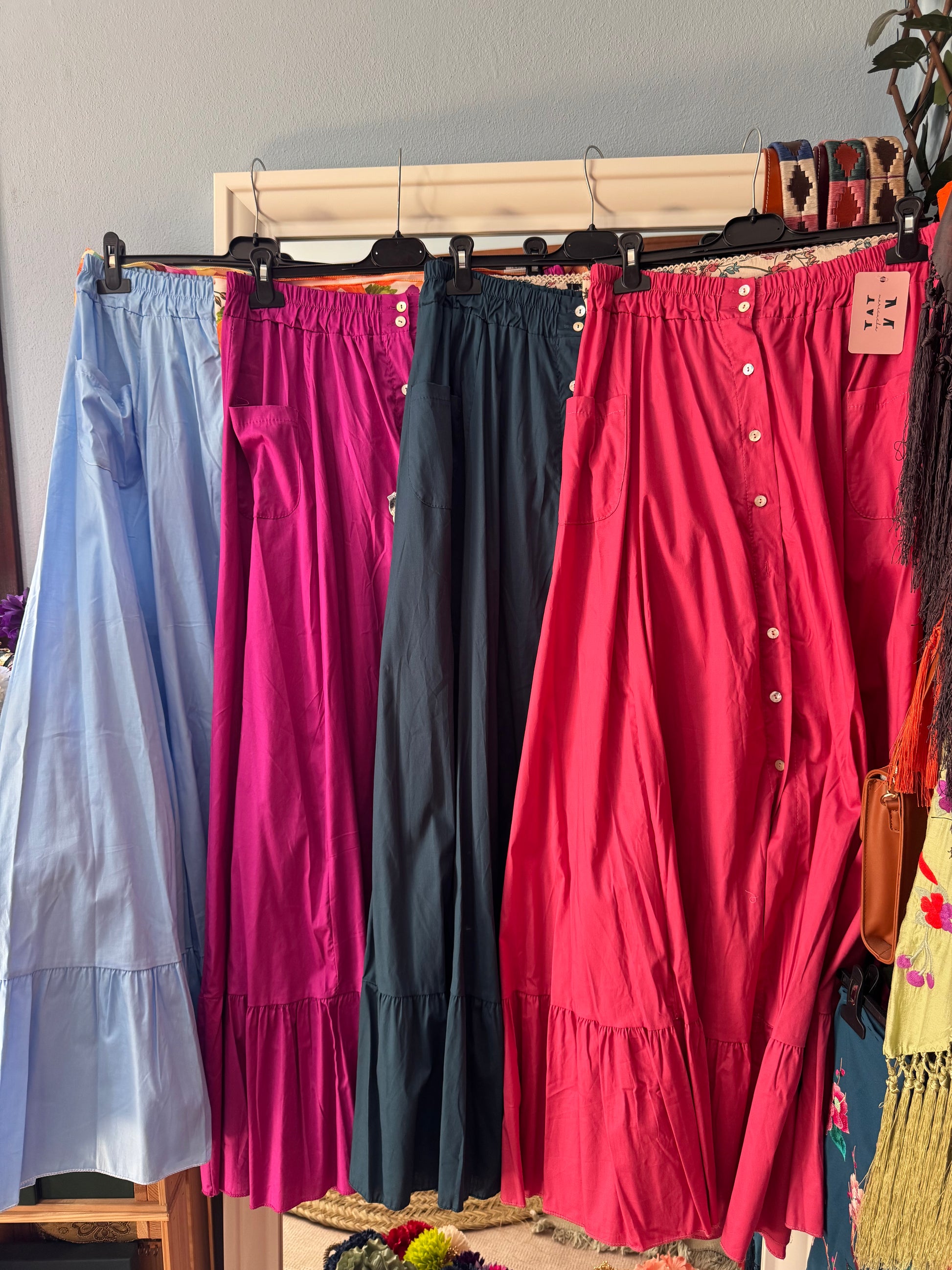 FALDA ABOTONADA DESDE LA CINTURA (CINTURA ELÁSTICA) HASTA LA RODILLA, DESPUÉS CONSTA DE UNA RAJA HASTA ABAJO.
