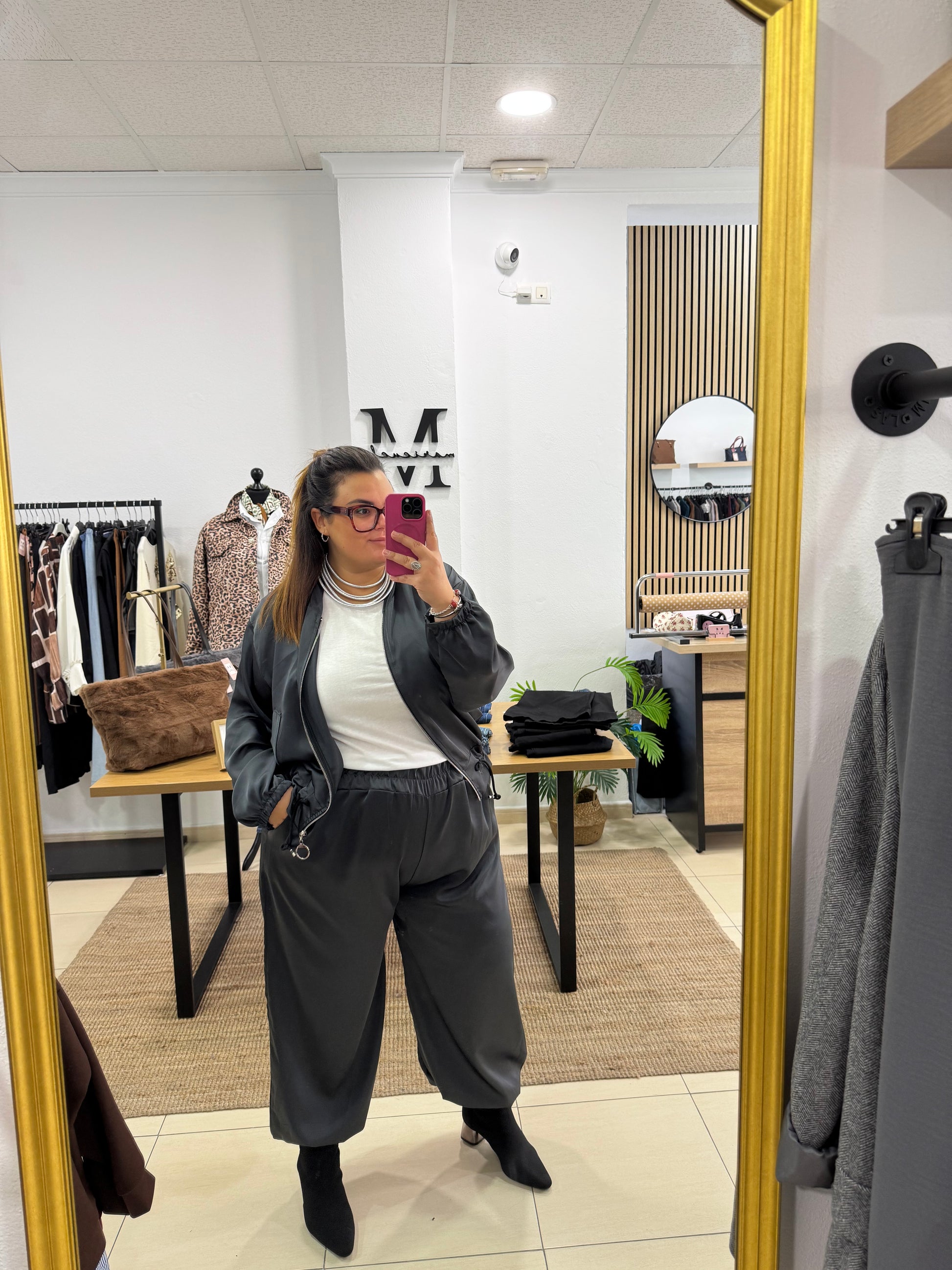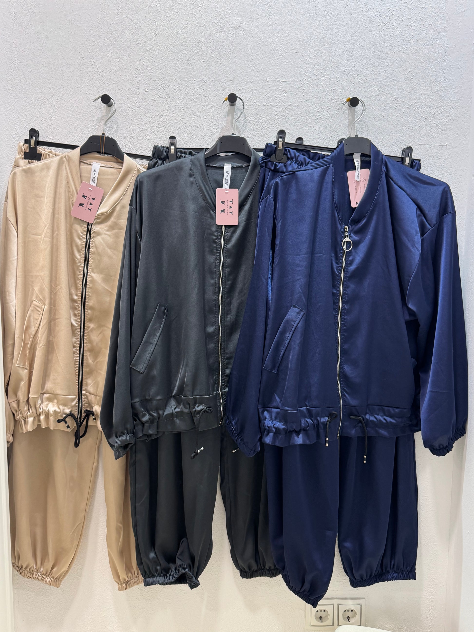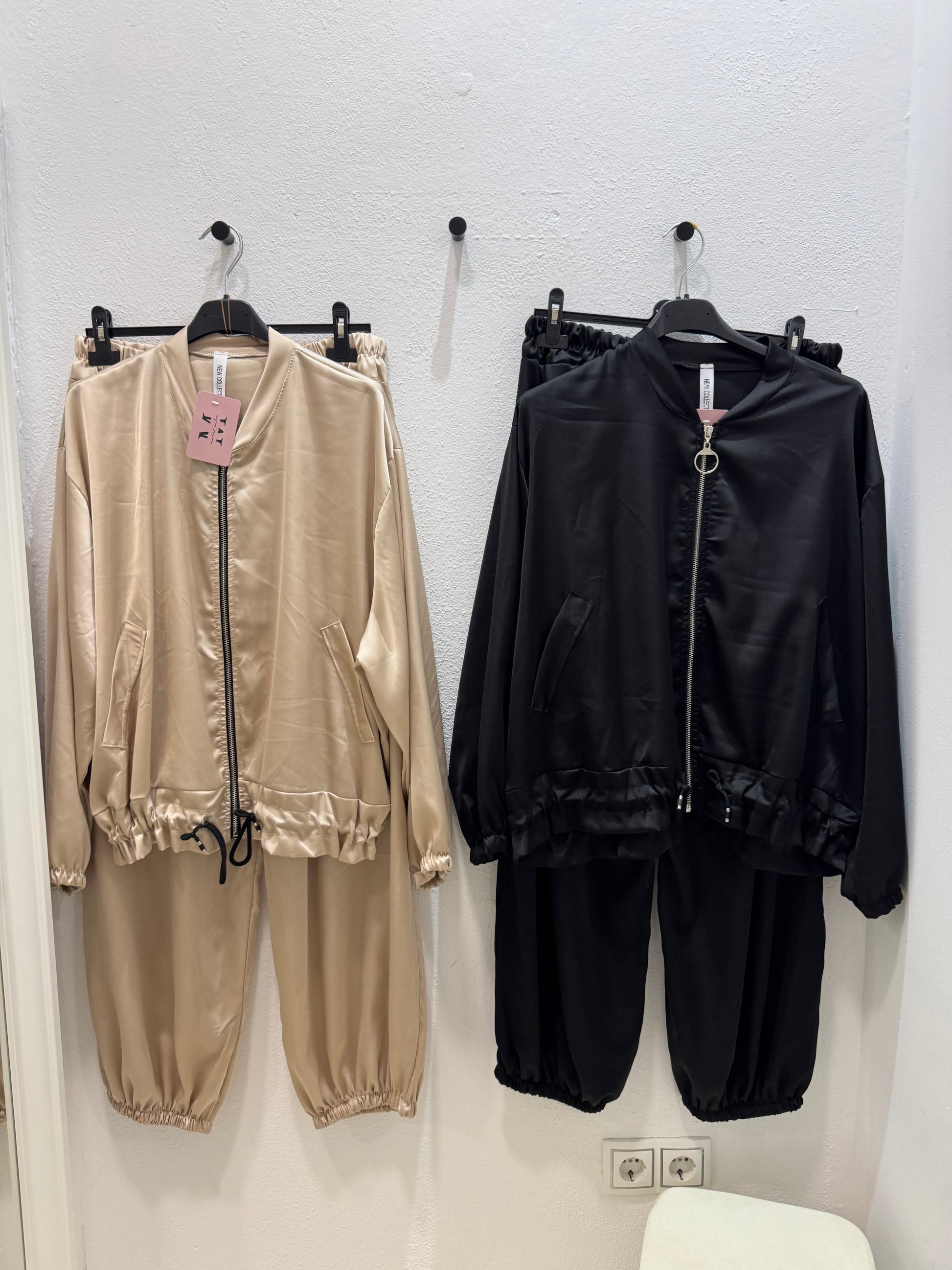 Conjunto de satén, consta de pantalones bombachos y bomber cortita ajustable a la cintura.