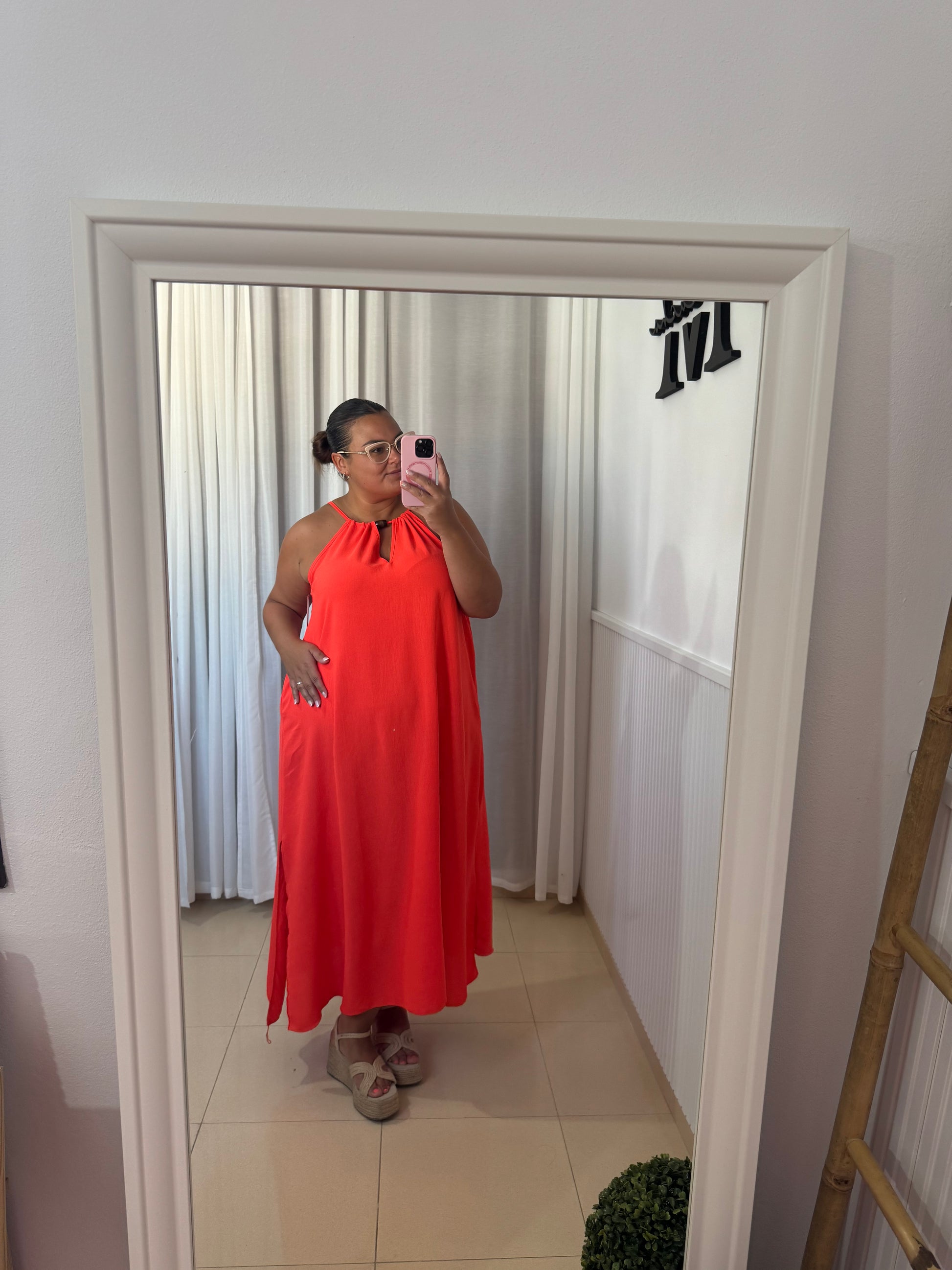 Vestido con cuello halter, anudado detrás para regular la medida del tirante.